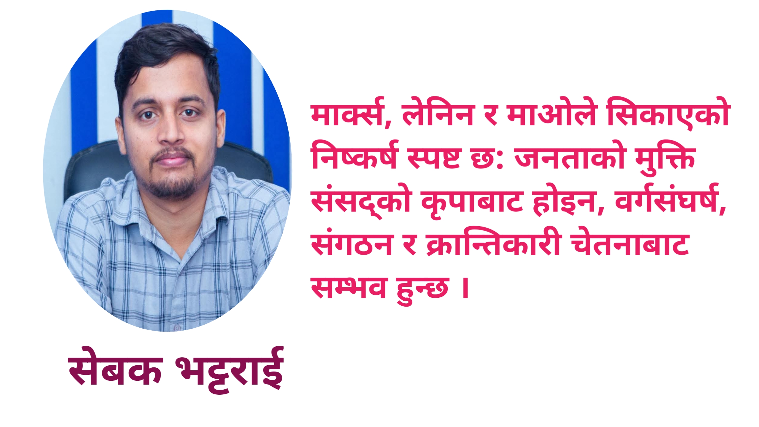 आजको मुख्य प्रश्न संविधान संशोधन, चुनावी प्रणाली वा अनुहार परिवर्तनको होइन । मुख्य प्रश्न कुन वर्ग सत्तामा छ? भन्ने हो । जबसम्म दलाल पूँजीवाद, साम्राज्यवादी हस्तक्षेप र सामन्ती अवशेष समाप्त हुँदैनन्, तबसम्म कुनै संसद्, कुनै चुनाव र कुनै सरकार जनताको हुन सक्दैन ।