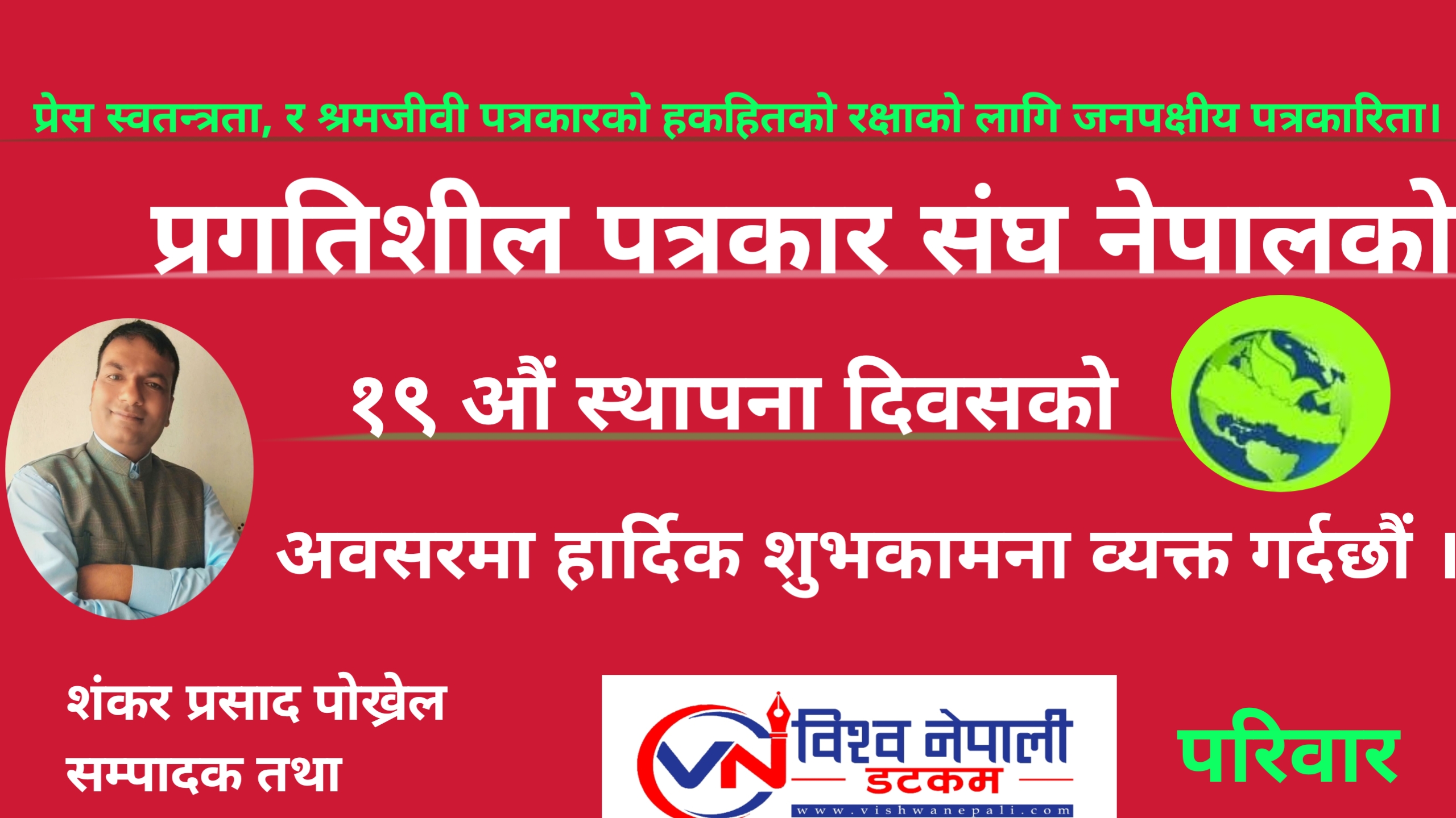 प्रगतिशील पत्रकार सङ्घ, नेपालको उन्नाइसौँ स्थापना दिवसको अवसरमा सङ्घका केन्द्रीय सदस्य तथा विश्व नेपाली डटकम का सम्पादक शंकर प्रसाद पोख्रेल ले हार्दिक शुभकामना व्यक्त गर्नुभएको छ।