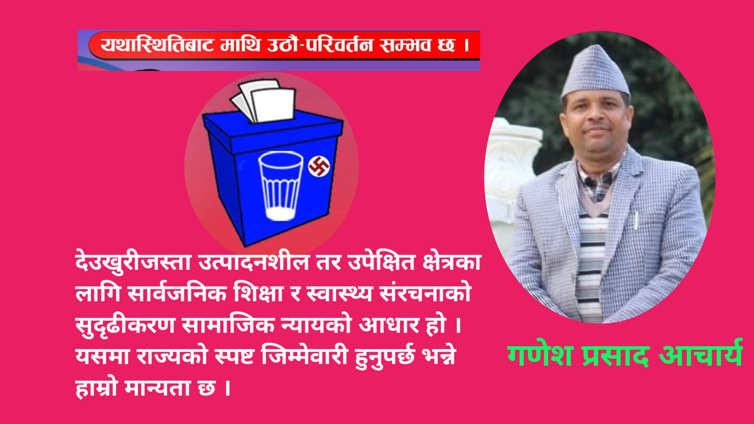 यो निर्वाचन व्यक्तिको मात्र छनोट होइन, राजनीतिक सोच र विकासको दिशाको छनोट हो । भावनात्मक अपिलभन्दा माथि उठेर, तथ्य, यथार्थ र दीर्घकालीन हितका आधारमा निर्णय गर्ने समय आएको छ। म आफु राष्ट्रिय जनमोर्चाको तर्फ देखि प्रतिनिधिसभाको लागि यस क्षेत्रको उम्मेदवार भएको कारण यहाँ कुनै चमत्कारी वाचा लिएर आएको छैन । म देउखुरीको ऐतिहासिक यथार्थ, सामाजिक संरचना र आर्थिक सम्भावनालाई गम्भीरतापूर्वक बुझेर, क्रमिक तर दिगो परिवर्तनको बाटो प्रस्ताव गर्न आएको हुँ । यो बाटो सबै समुदायलाई समेट्ने, श्रमलाई सम्मान गर्ने र नीति निर्माणमा नागरिकको भूमिका सुनिश्चित गर्ने बाटो हो ।