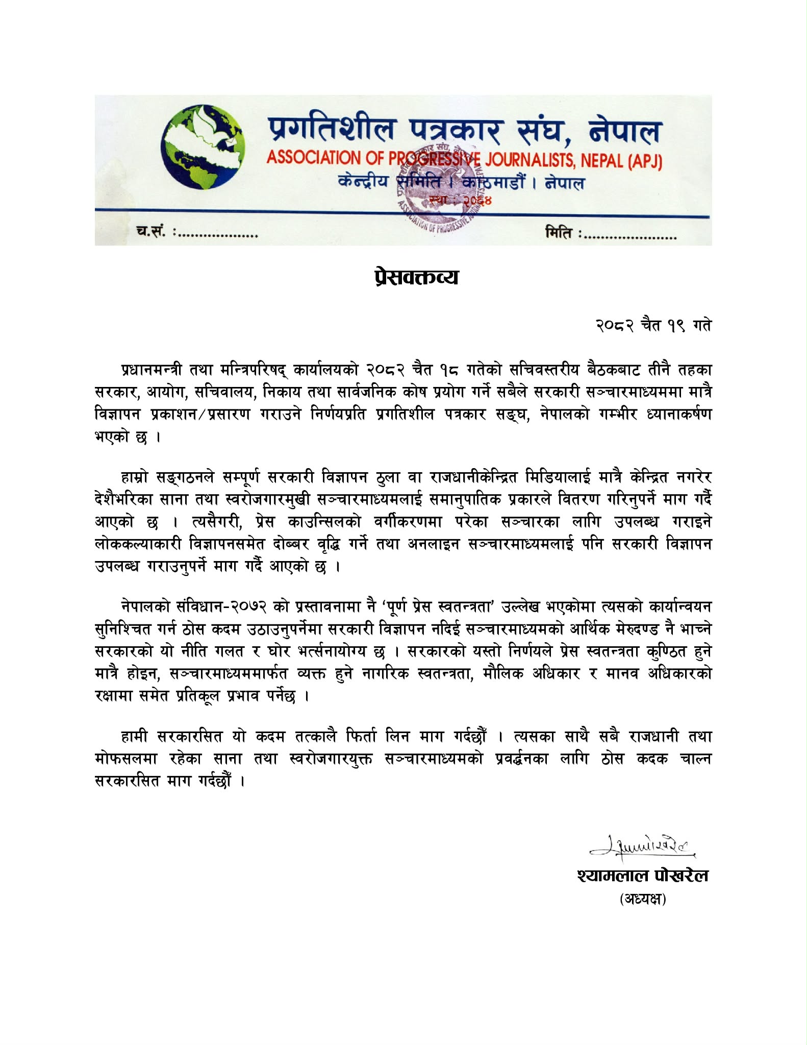 बिहीबार संघका केन्द्रीय अध्यक्ष श्यामलाल पोखरेल ले विज्ञप्ति जारी गर्दै निजी क्षेत्रका सञ्चारमाध्यमलाई विज्ञापन रोक्ने निर्णय गलत र स्वतन्त्र प्रेस विरोधी भएको स्पष्ट पार्नुभयो।