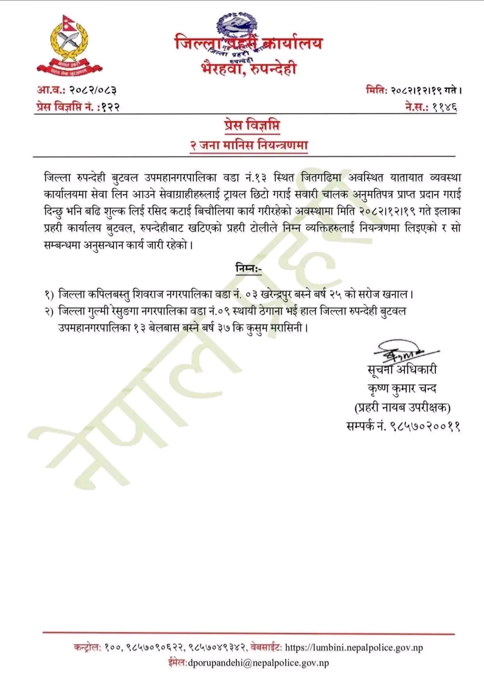 बुटवलमा सवारी चालक अनुमति पत्र (लाइसेन्स) दिलाइदिने बहानामा ठगी गर्ने दुई बिचौलिया पक्राउ परेका छन्। पक्राउ पर्नेमा कपिलवस्तु शिवराज नगरपालिका–३ का २५ वर्षीय सरोज खनाल र गुल्मी रेसुङ्गा नगरपालिका–९ स्थायी घर भएकी बुटवल–१३ बेलबास बस्ने ३७ वर्षीया कुसुम मरासिनी रहेका छन्।
