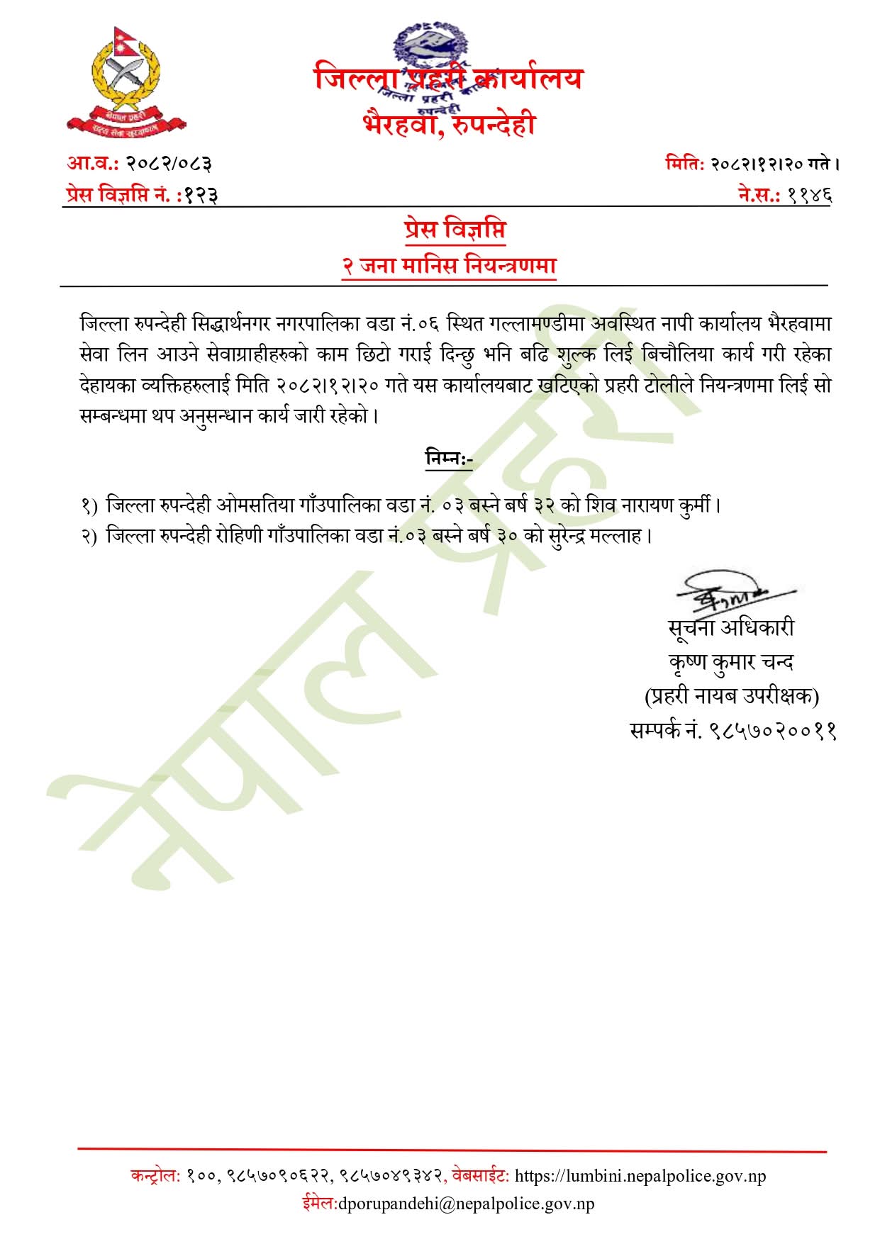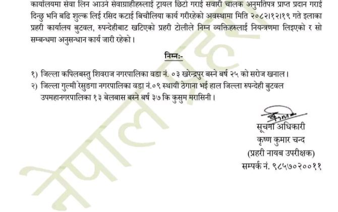 रुपन्देही । जिल्ला प्रहरी कार्यालय रुपन्देहीले सेवाग्राहीसँग अतिरिक्त शुल्क लिएर काम गरिदिने भन्दै बिचौलियाको भूमिका खेलेका दुई जनालाई नियन्त्रणमा लिएको जनाएको छ।