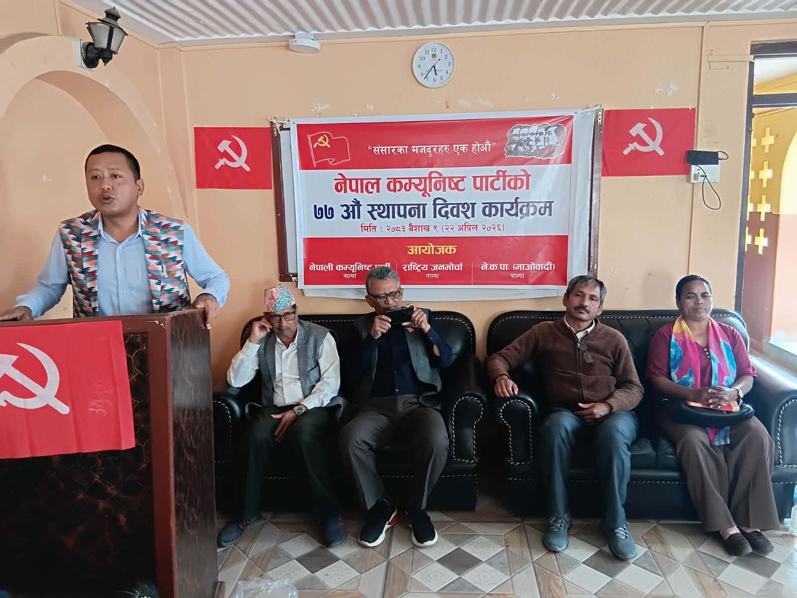 पाल्पा, तानसेन — पाल्पामा विभिन्न वामपन्थी दलहरूले संयुक्त रूपमा ७७औं कम्युनिस्ट पार्टी स्थापना दिवस मनाएका छन्। नेपाली कम्युनिस्ट पार्टी पाल्पा, राष्ट्रिय जनमोर्चा पाल्पा र नेकपा माओवादी पाल्पाको संयुक्त आयोजनामा सदरमुकाम तानसेनमा कार्यक्रम सम्पन्न भएको हो।