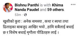 माननीय बिष्णु पन्थिले फेसबुक स्टाटमा जानकारी गराउदै हामी सबैको अथक प्रयास अनेक समस्या ब्यथा ढिलाइका बाबजुद सफल भएको भन्दै मृगौला पिडितलाई बधाई दिनुभएको छ।यस्तो छ माननीय बिष्णु पन्थिको फेसबुक स्टाट ।
